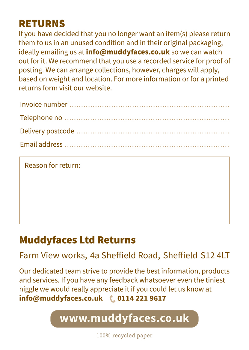 If you are not completely satisfied with your purchase you can return it to us within 28 days of receipt and we will either refund your money or, if preferred, we will exchange the item for you