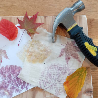 A simple children's craft activity using a hammer to create amazing leaf prints on cloth & paper.